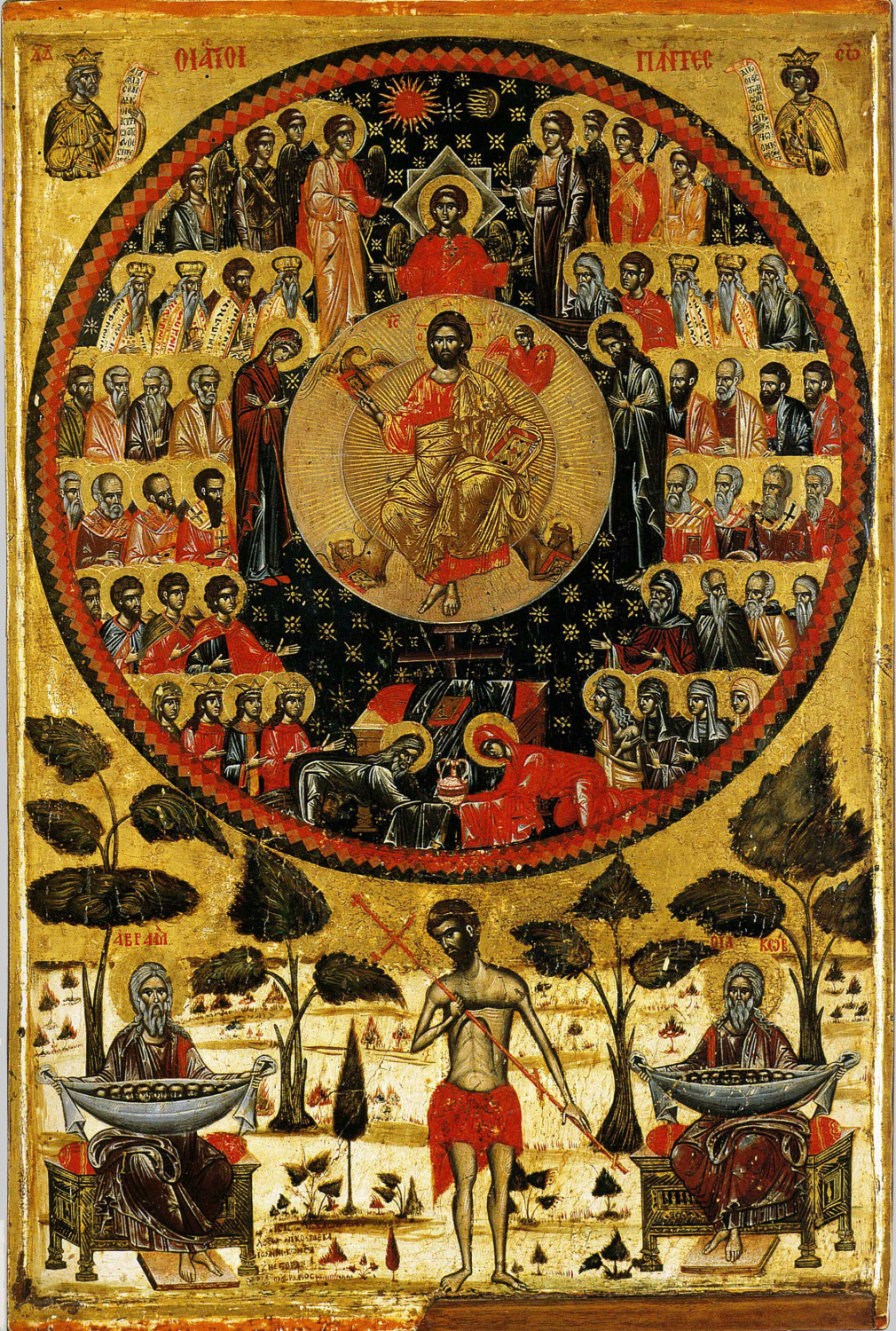Ра́дуйтеся, Ено́ше и Илие́, пло́тию сме́рти невкуси́вшии и на не́бо восхище́ннии; ра́дуйтеся, Иса́ие, Дави́де и Дании́ле, зри́телие та́ин Бо́га Вседержи́теля.